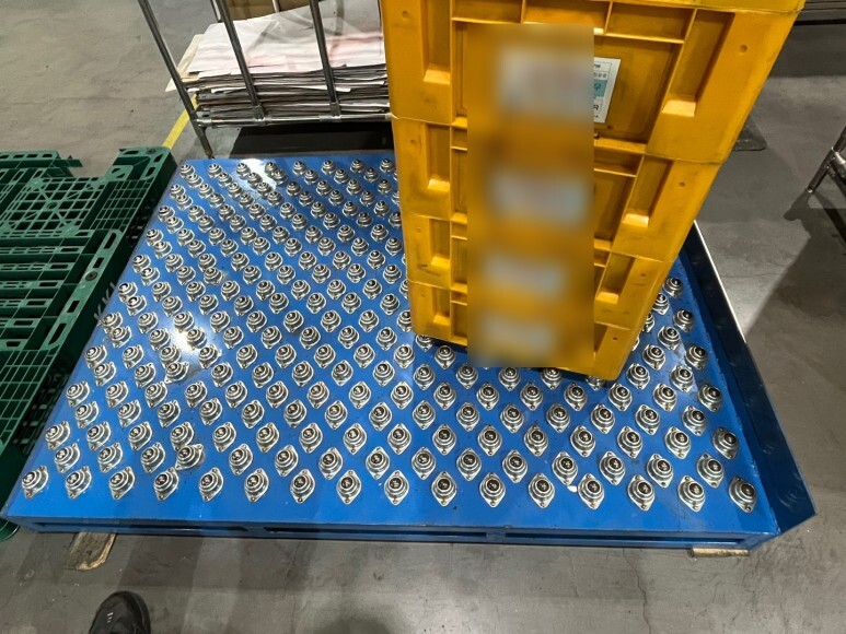 플라스틱박스를 왼쪽 초록색 파렛트에 이동을 시킨후 이동을해야할경우, 박스가 무거워 사람이들지 못하였을때 파란색 철판에 깔린 볼베어링을 통해 편하게 이동을할수가있습니다.
