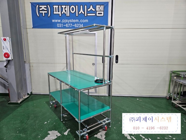 판재는 기존에 나갔던 작업대와 동일하게 POMAX 10T (Gray) + 정전매트 2T (Green) , 서스파이프 (Sus Pipe) , 메탈조인트 브라켓 (Metal Joint , Zinc) , 바퀴 (CASTER) , LED등, S/W 및 전선작업,