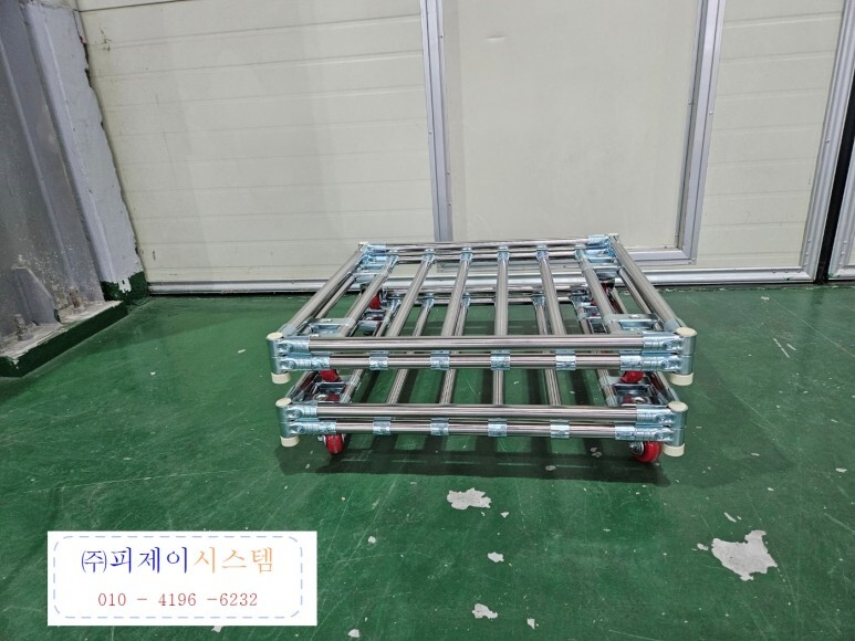 대차의 효율성은 운발할수있는 박스를 대차위에 적재해놓은후 내가 원하는곳에 움직여 사용할수있는 동선의 효과를 보실수있으며, * * * 기업 회사의 박스기준으로 맞춤제작이되고 박스가 아래로 빠지지않게 파이프를 등분하여 작업한 사례입니다. 보통 박스가 무거울경우 위 사진과같이 설계 및 제작이 이루어지고있습니다.
